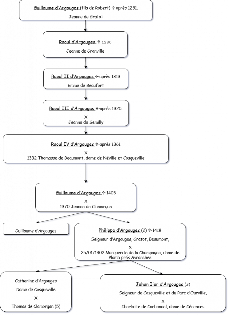 (5) En 1424, Thomas de Clamorgan s’intitulait seigneur de Cosqueville du chef de sa femme Catherine d’Argouges.